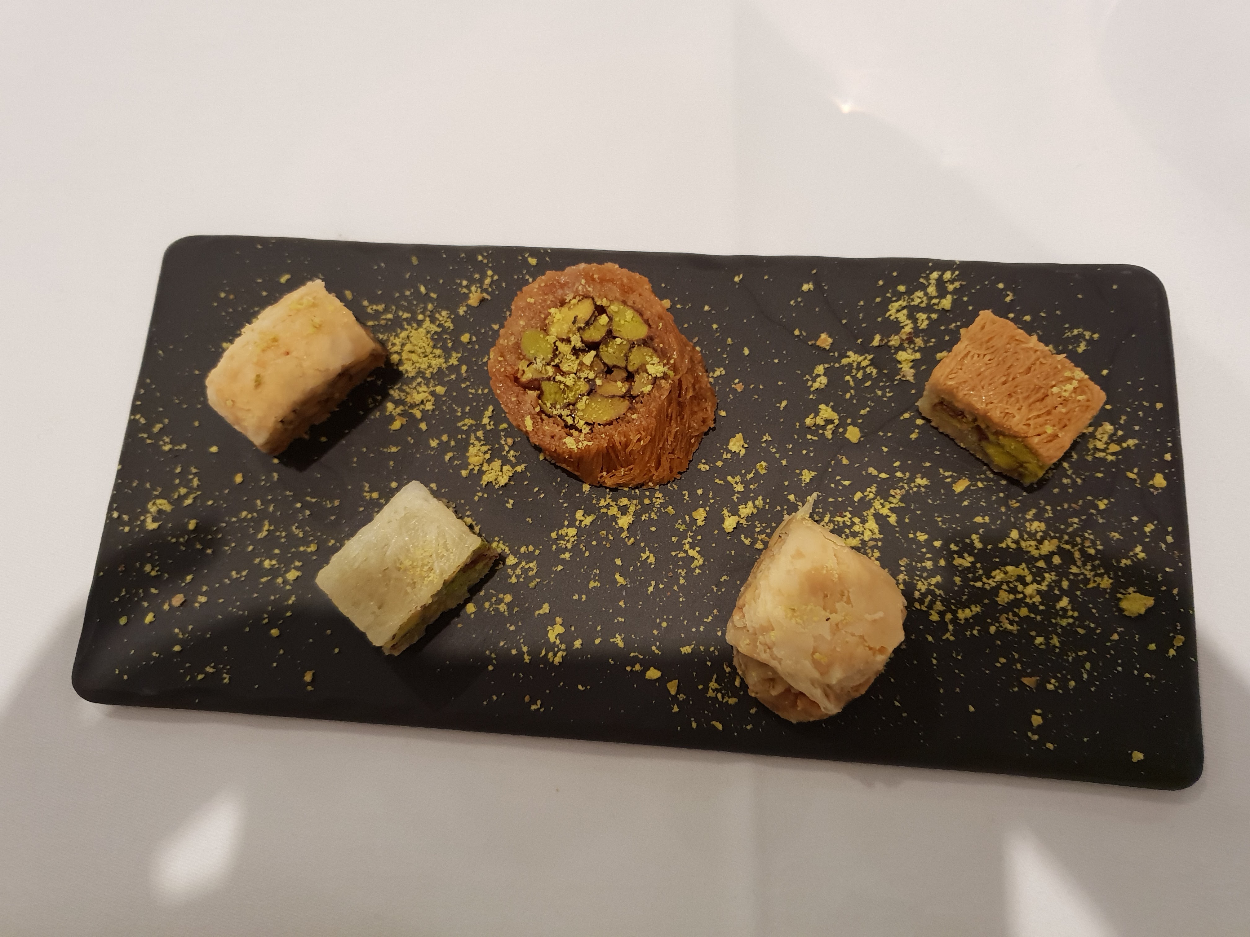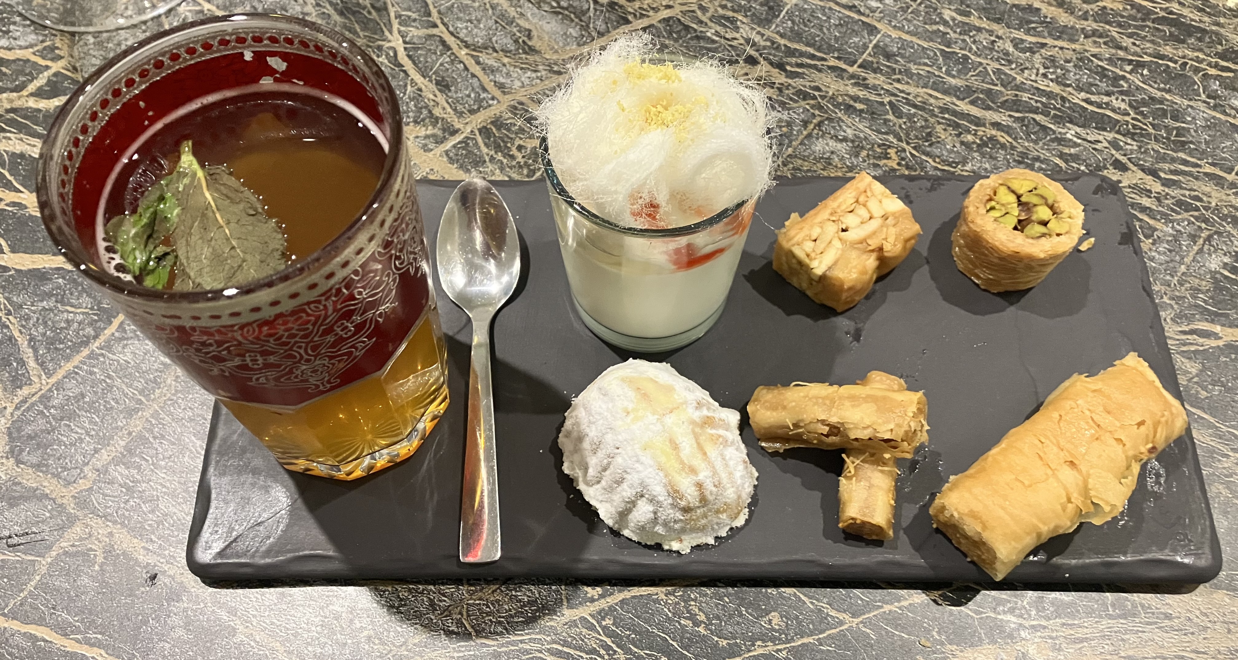 Que dire d'autre que la Soirée fut une Magnifique Découverte.. des Mets Délicieux que nous ne connaissions pas du tout... Le Menu Découverte me semble être la meilleure façon de faire Connaissance avec cette Cuisine Libanaise Haute en Couleurs et en Goûts... Une Délicieuse Assiette de Mezzé variés... une Savoureuse Grillade... et alors les Pâtisseries Purement Libanaises qui en viennent directement... Pour moi c'est évident.. car ce que l'on sentait ce n'était pas le Sucre comme pour d'autres pâtisseries orientales décevantes,mais Là... c'était les Ingrédients divers avec beaucoup de Croustillant.. de noisettes.. de pistaches.. d'amandes... le Miel si justement dosé.. Je ne vous dis pas tout... je vous laisse le Plaisir de découvrir les Recettes Spéciales et Variées de cette Merveilleuse Cuisine... Je précise que le Prix du Menu me semble correct.. vu la Qualité... pour se Faire Véritablement Plaisir... Un Vin particulier à Connaître...🍷 Avec un Accueil Très Chaleureux du Serveur en particulier très avenant... Je terminerai sur la Très Belle Décoration pas trop chargée.. la Musique Si Enchanteresse.. On se sent presque au Pays Oriental en fermant les yeux... Merciii...🌠🎉