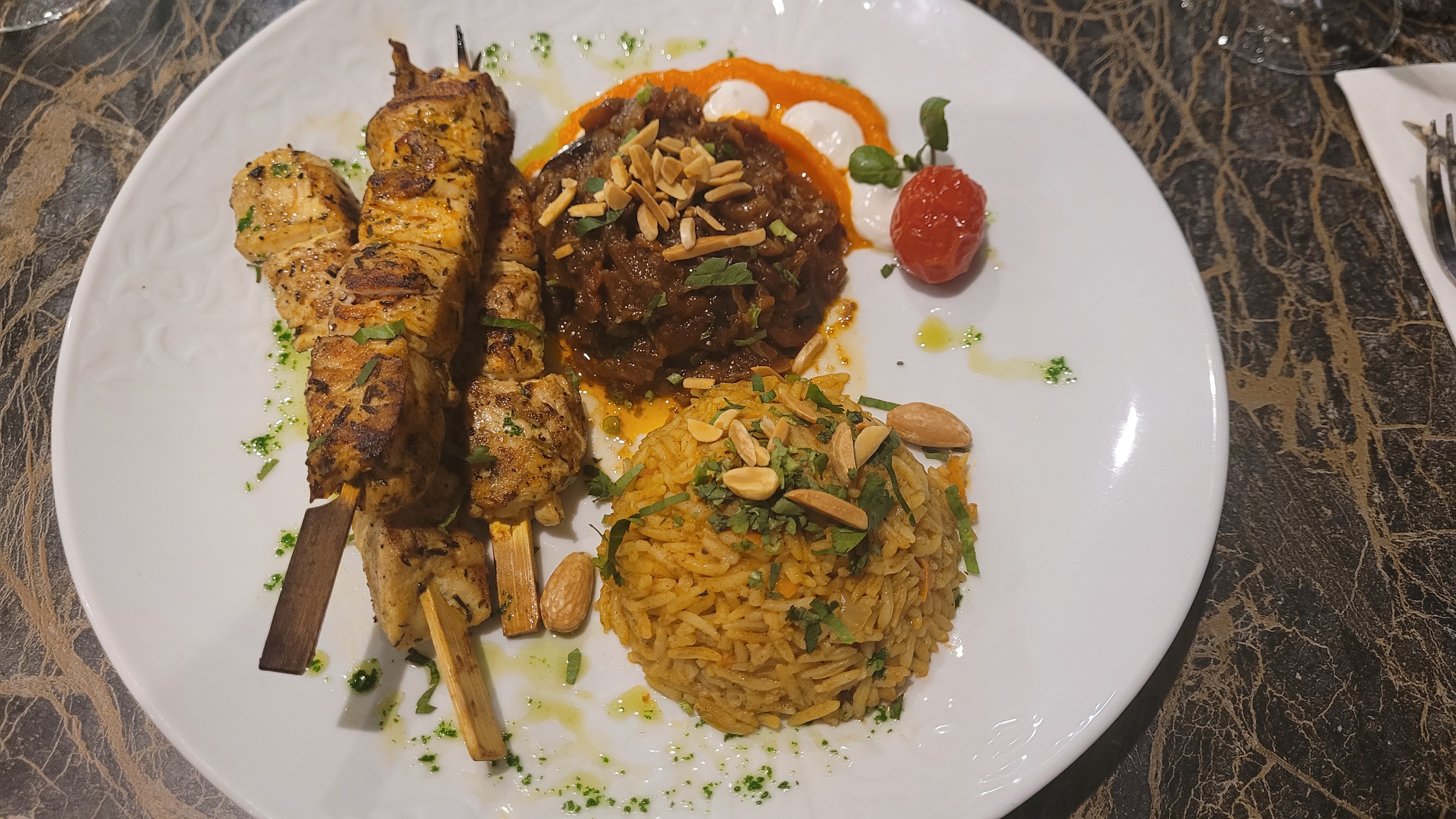 Bonjour Le restaurant est magnifique ainsi que la nourriture qui es tous simplement délicieuse ! Les brochettes d'agneau sont un véritable régal,super tendre et bien juteuse... Une évasion assuré... Le personnel est top.