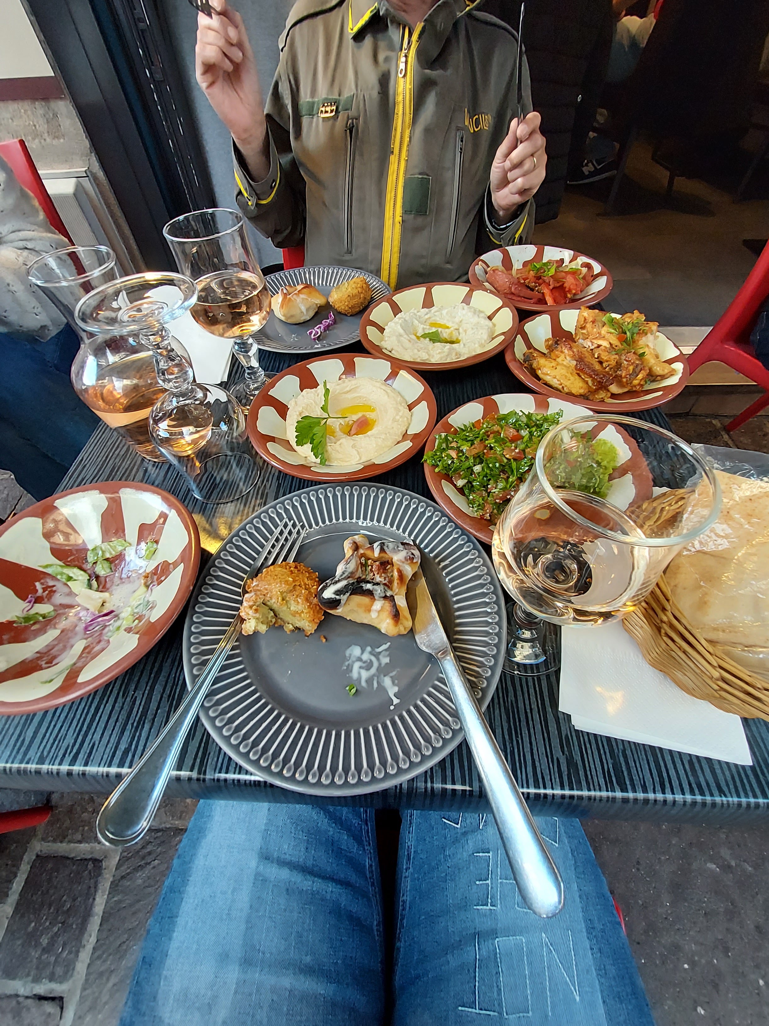 5 mezze pris à la carte. Très bon ! Et on est calé. C’est très probablement fait maison. Belle découverte…. Ah et on est bien assis ! Pratique pour digérer tranquillement cette merveilleuse cuisine :)