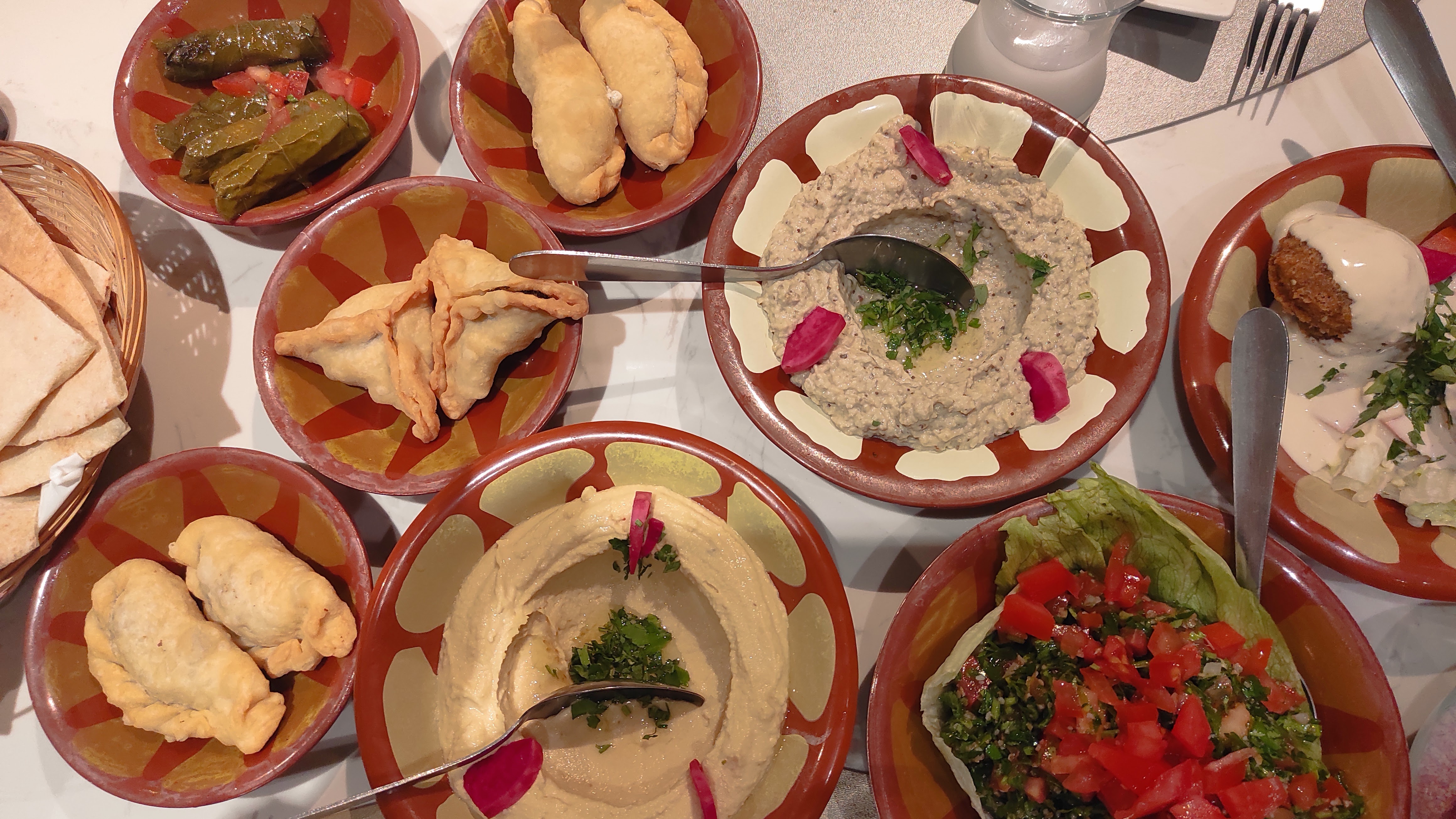 Bien que l'on dise que les goûts et les couleurs ne se discutent pas, je peine à comprendre les avis positifs concernant ce restaurant. Pour ma part, j'estime que la cuisine est médiocre. Nous avons opté pour le menu mezzé libanais, composé de dix entrées, et toutes se sont avérées immangeables. Le taboulé était principalement constitué de persil, sans autre saveur notable. Les entrées à base de viande partageaient toutes un goût désagréable et uniforme, et les feuilles de vigne étaient tout aussi décevantes. Objectivement, je n'ai trouvé aucun plaisir à dîner dans cet établissement.