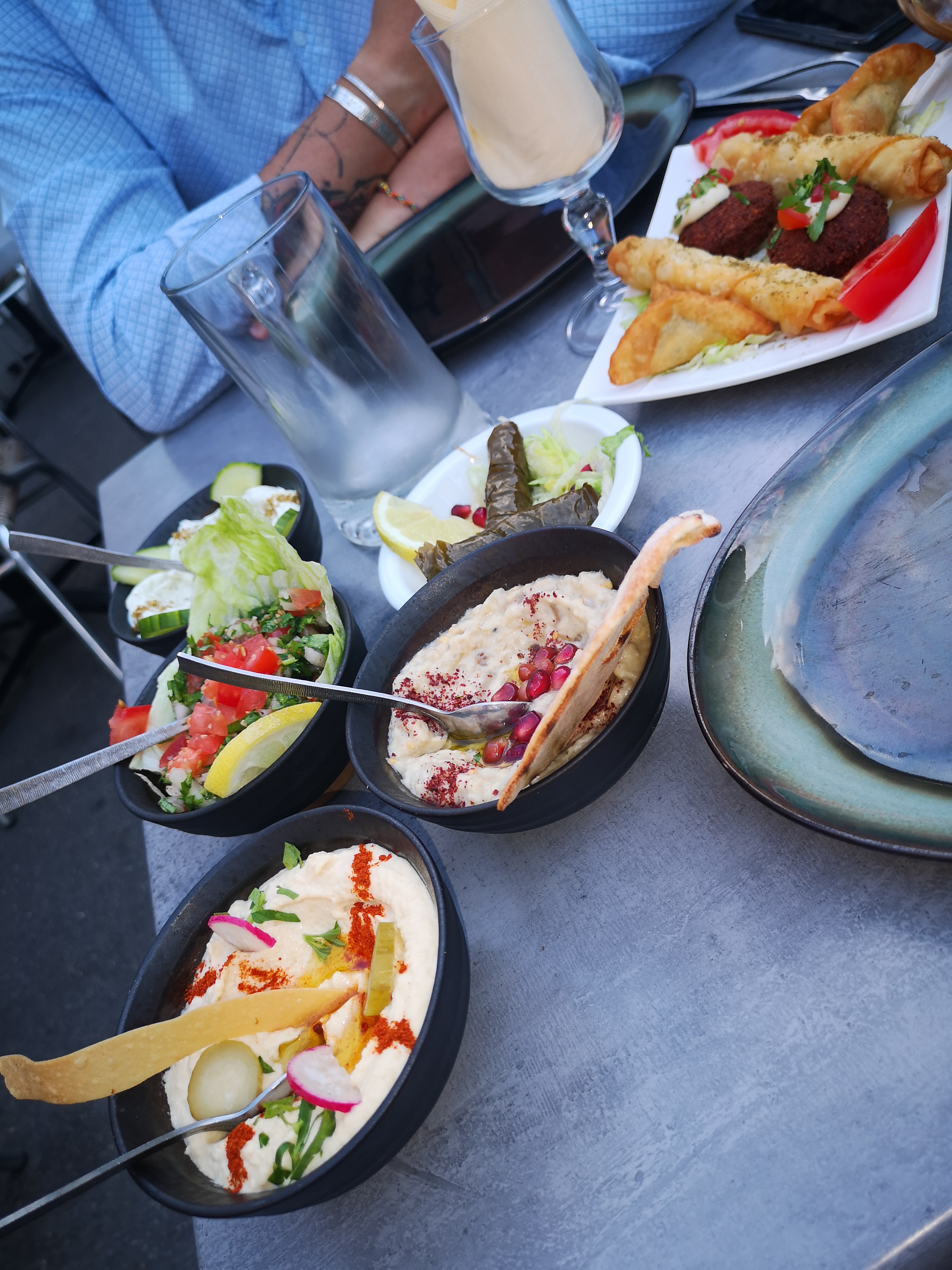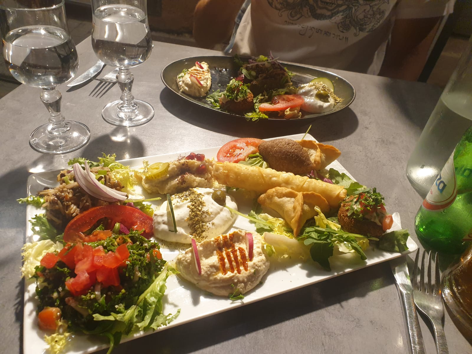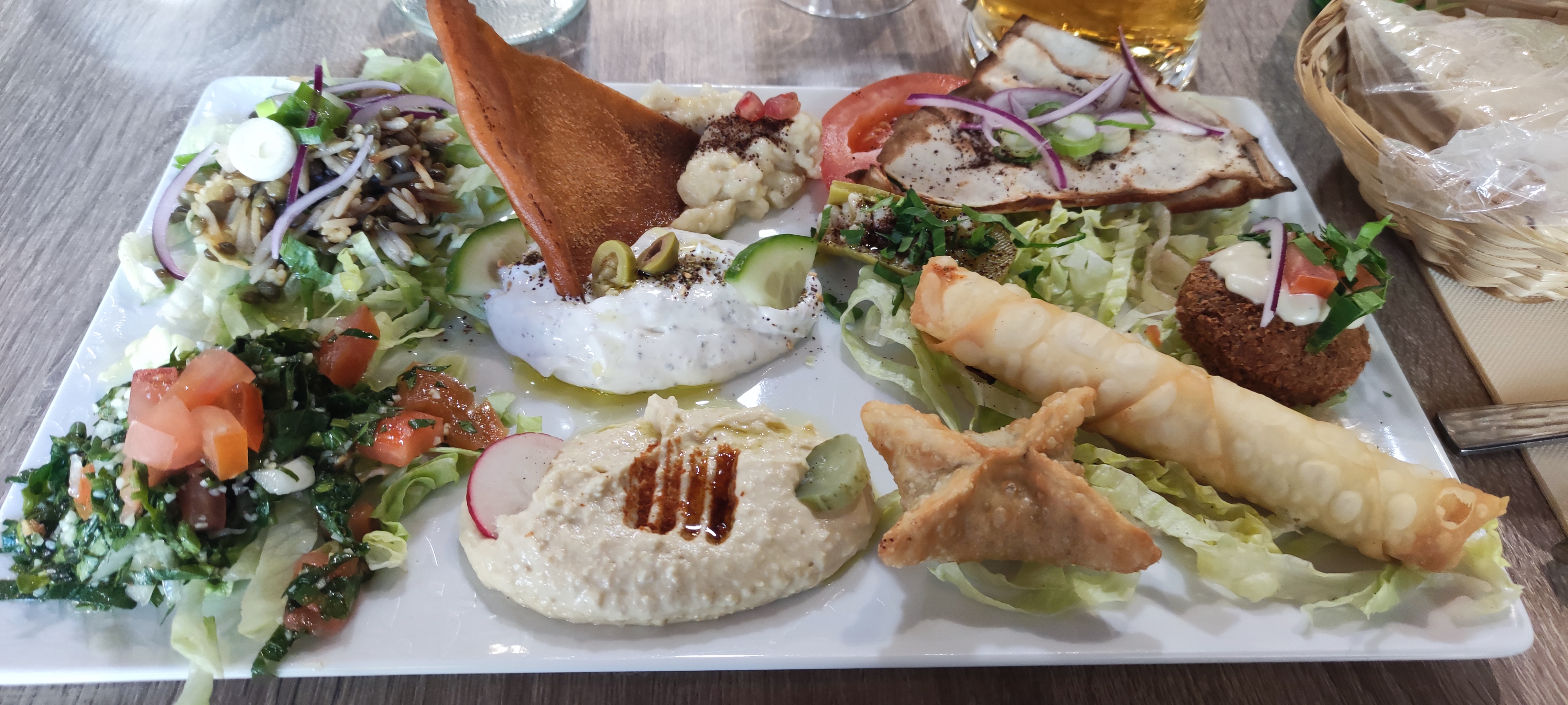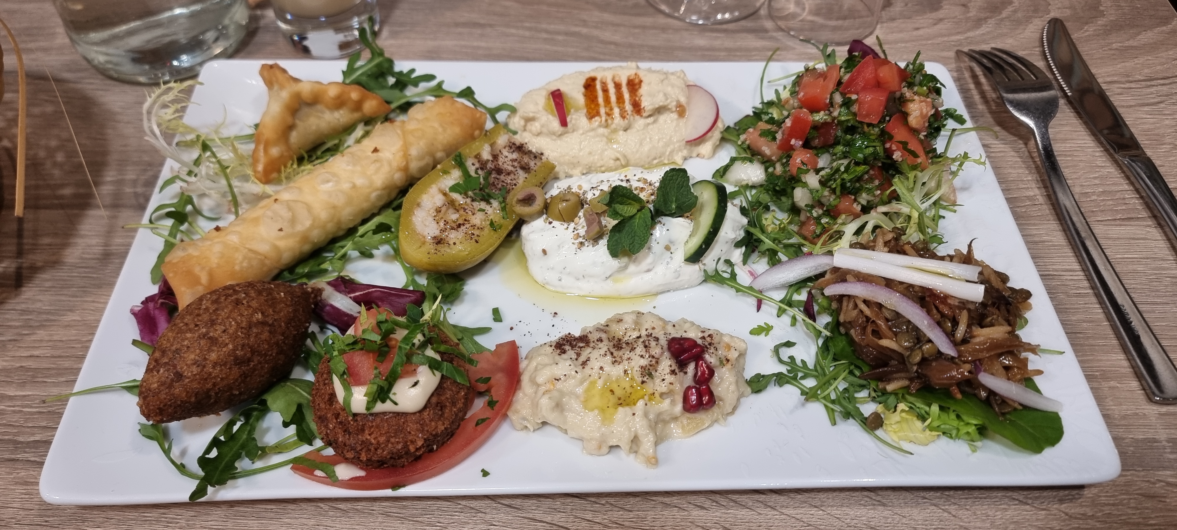 Menu Mezze, Nous avons un peu râlé car les plats sont à partager, quand on est plusieurs, il faut un peu s'organiser, sinon très jolie présentation et c'est bon, ça change dépaysement garanti. Et nous avons attendu l'eau. Du coup nous avons été chouchoutées côté service ensuite. Ce qu'il manque sur la carte c'est plus de détails, comme cette précision pour le Mezze. Et sur l'équivalent en menu français (entrée/plat) surtout. Ensuite ça ne respire pas la bonne humeur, c'est un peu tendu au niveau du service, on ressent la pression économique. Ce qui gâche un peu le moment.