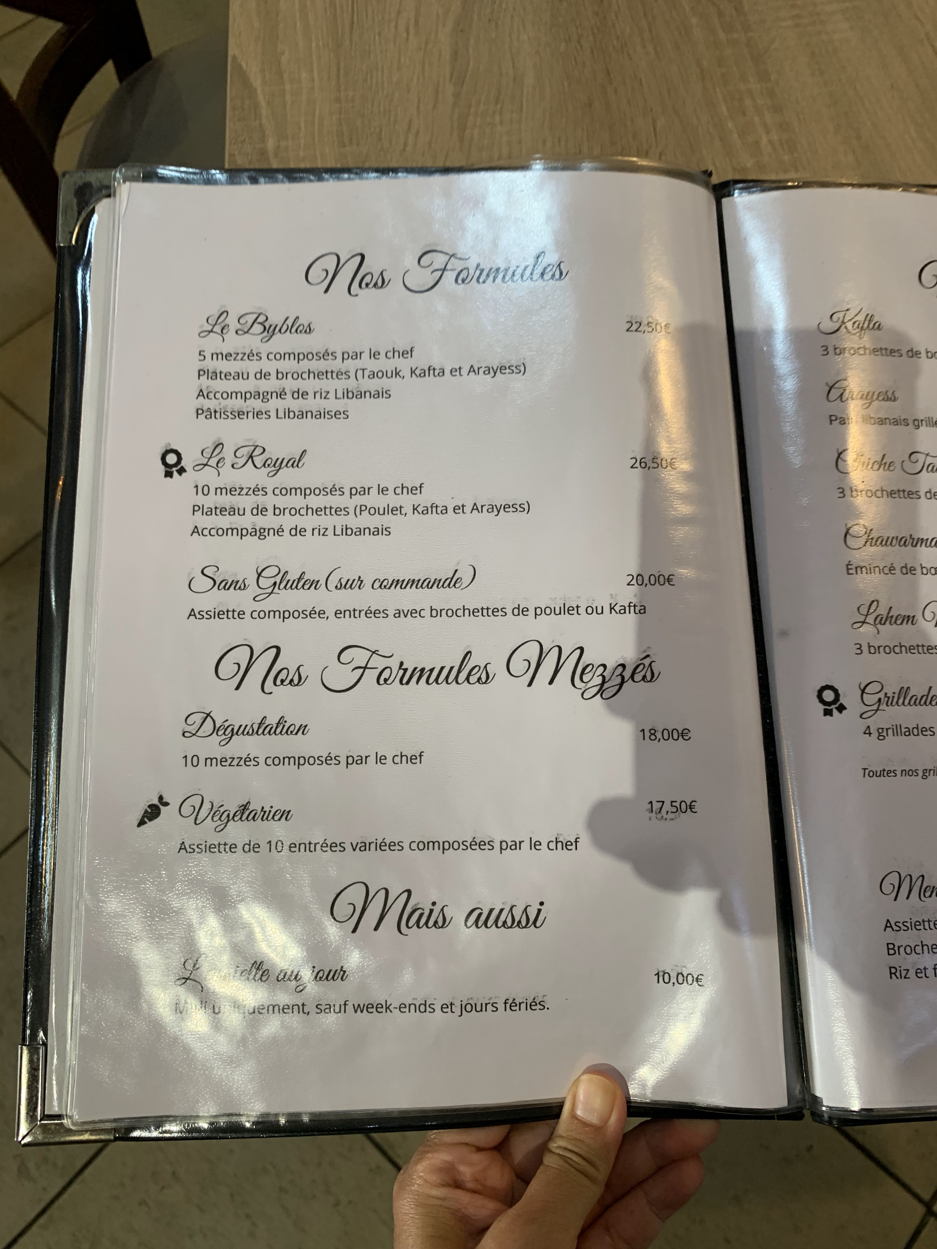 Nous avons testé le menu du Byblos à 20,90€, assez décevant... Rien à redire concernant l'entrée mais arrivé au plat grosse déception, on nous emmène un plateau de brochettes à diviser pour toute la table et deux petits bols de riz pour 8 personnes, résultat des courses dans l'assiette : deux minis brochettes qui se battent en duel, un mini pain fourré à la viande et une cuillère à soupe de riz par personne ! Très peu de viande dans l'assiette, 100g de viande à tout casser. Pas de légumes... On demande une portion de riz en plus qu'on nous emmène une fois le plat terminé (inutile). Et enfin le dessert : un chausson fourré et un carré à la fleur d'oranger, encore une fois deux petites pâtisseries qui se battaient en duel dans une petite assiette alors que des membres de ma famille qui ont pris le même menu un peu plus tôt dans la semaine avaient eu 3 pâtisseries dans l'assiette (ça aurait été bien de nous annoncer si il y avait une rupture de stock...). Entre le plat et le dessert nous avons attendu un bon 45min, nous nous endormions sur nos chaises... L'accueil était cependant très correct, mais pour un menu de ce prix nous sommes malheureusement restés sur notre faim...