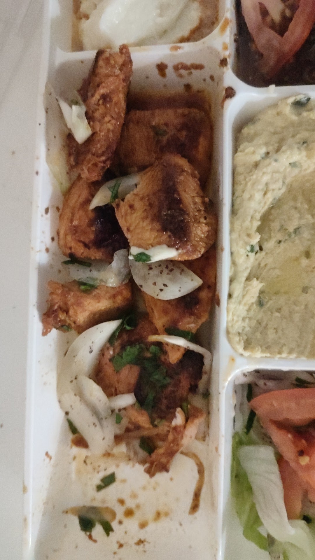 Chawarma au poulet pas bon, j'ai pas pu choisir la composition, les produits on dirait ils sont la depuis trop longtemps, houmous avec les rebords marron, poulet très sec, on dirait pas du poulet désolé, pourtant c'est a 6 euros, c'est a moin de 9 mètres de la maison mais j'irai plus jamais