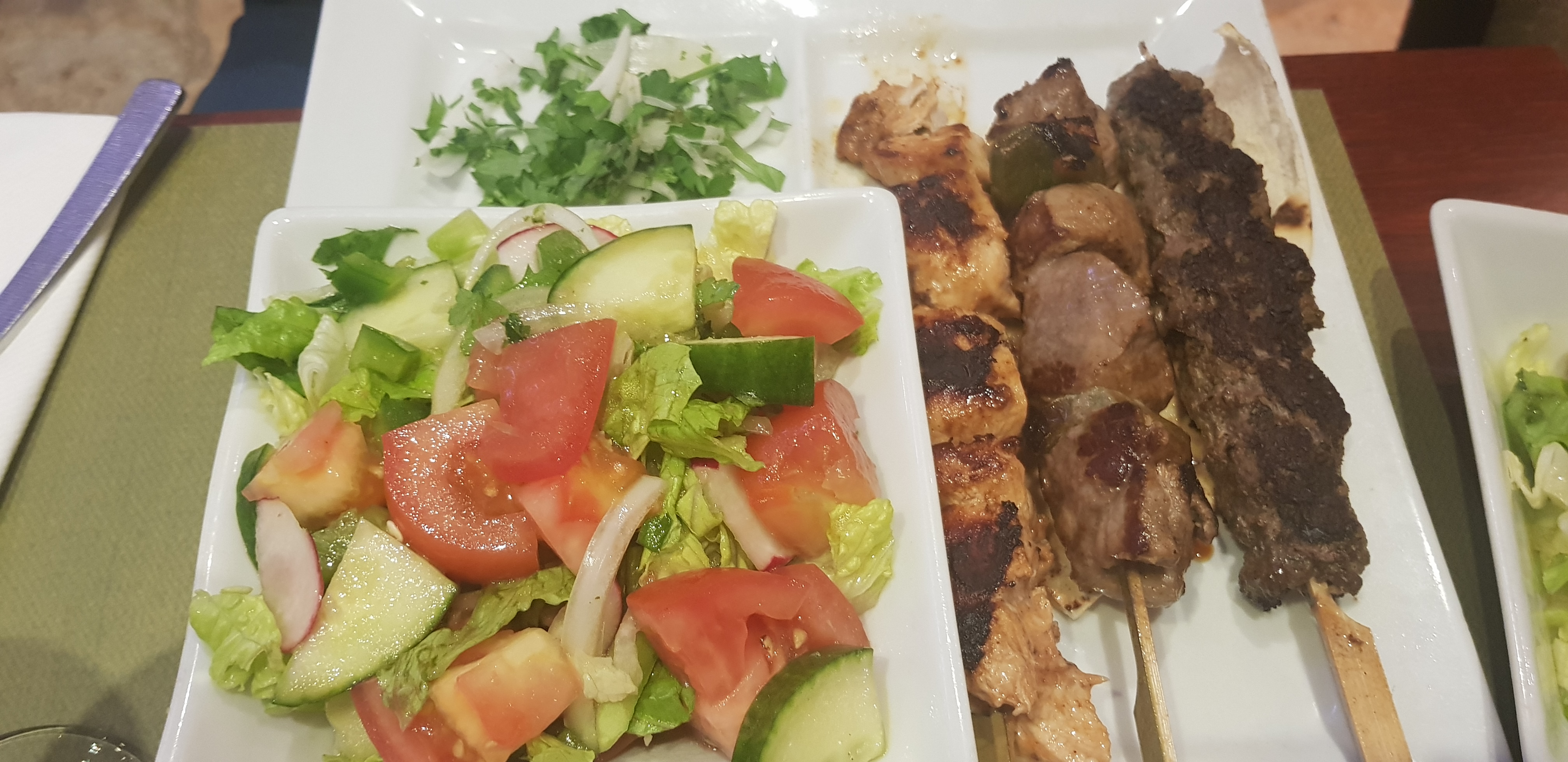 Excellent accueil, personnel attentif et professionnel. La salle est jolie mais peut être un peu trop éclairée . Les mezzes et les brochettes sont excellents. Nous reviendrons.