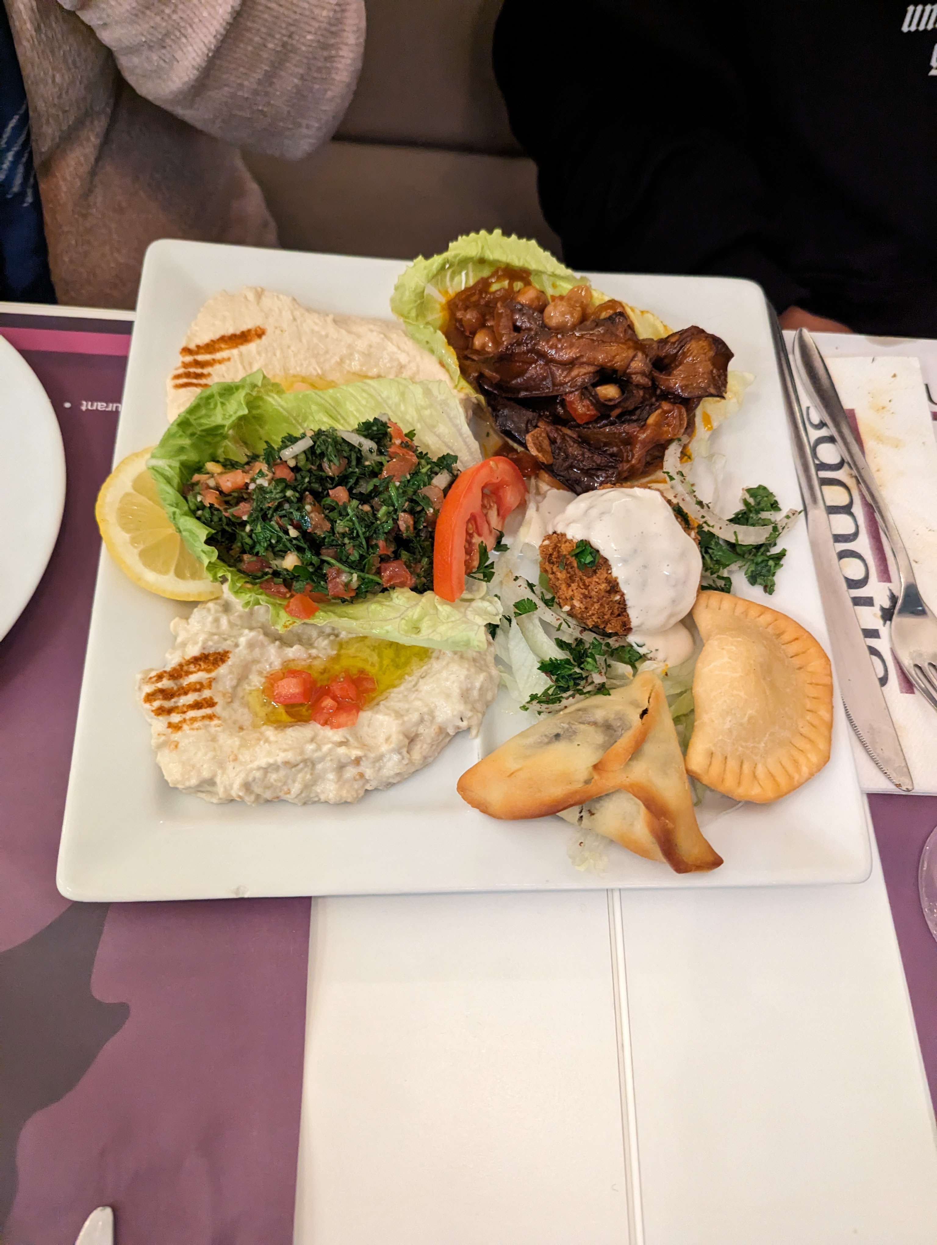 Assiettes de mezze copieuses et savoureuses. Il est possible d'adapter l'assiette vegetarienne en version vegan. Une bonne adresse !
