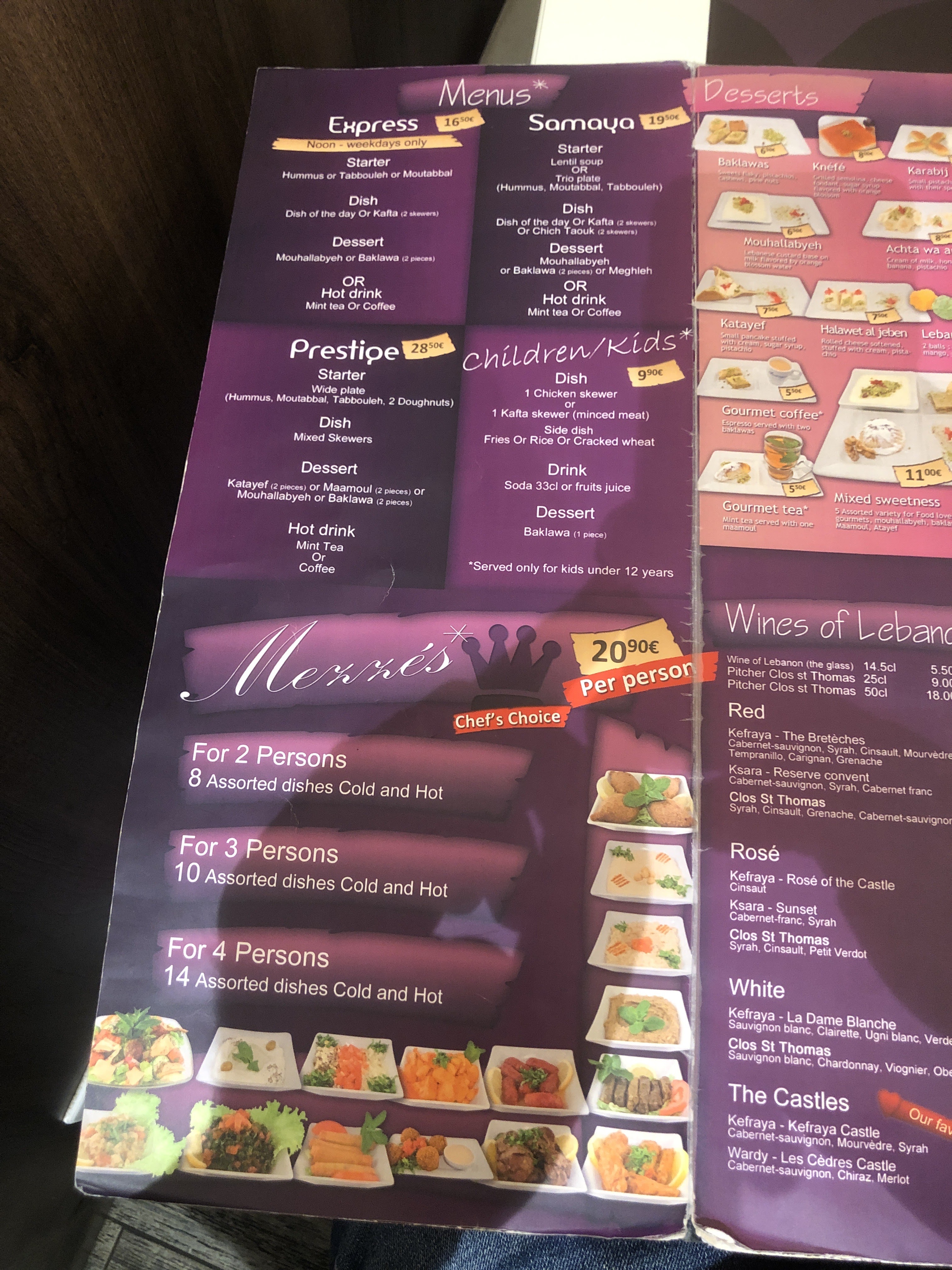 deçus par les mezes nous avons resrvez avec groupons et en arivan on a eu que les mezes les moin chere ou ce qui n'a pas ete vendu aussi les boisons trop chere et les enfants on a pas eu ni de araisse ni nacanek ni cafta en fin on a prix en plus 2 mini brochettes facture a 10 euros bref le diner c'est un fiasco car il sont tres radins et surtou sur laviande on la pas vue dans les mezes on a payez pour presque 65.euros pour que dale.