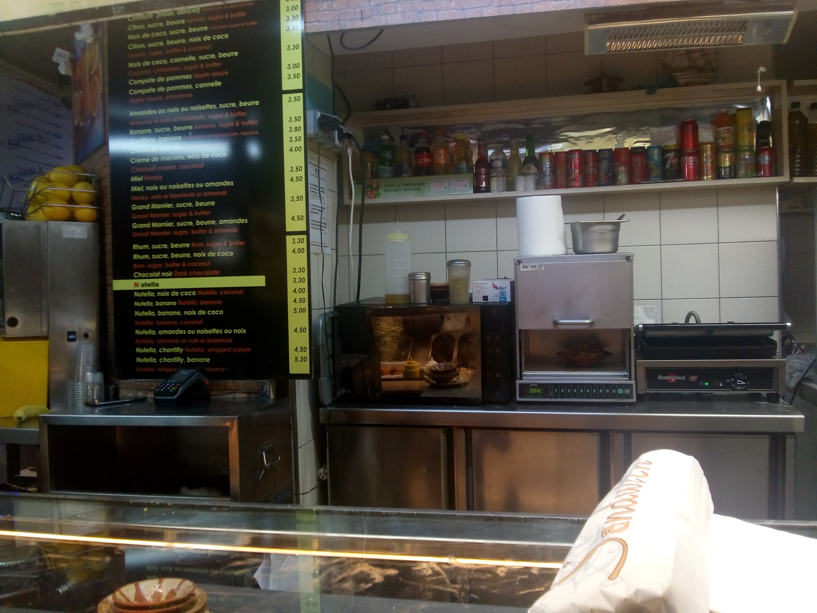 Un endroit petit mais parfait pour manger quelque chose de délicieux et rapide, nous avons été servis par un homme très sympathique qui parlait aussi espagnol, nous avons commandé deux crêpes et une galette (elle avait la forme d'un dorum) toutes délicieuses, elles sont énormes. Nous avons payé 28 € avec un Cocacola.
