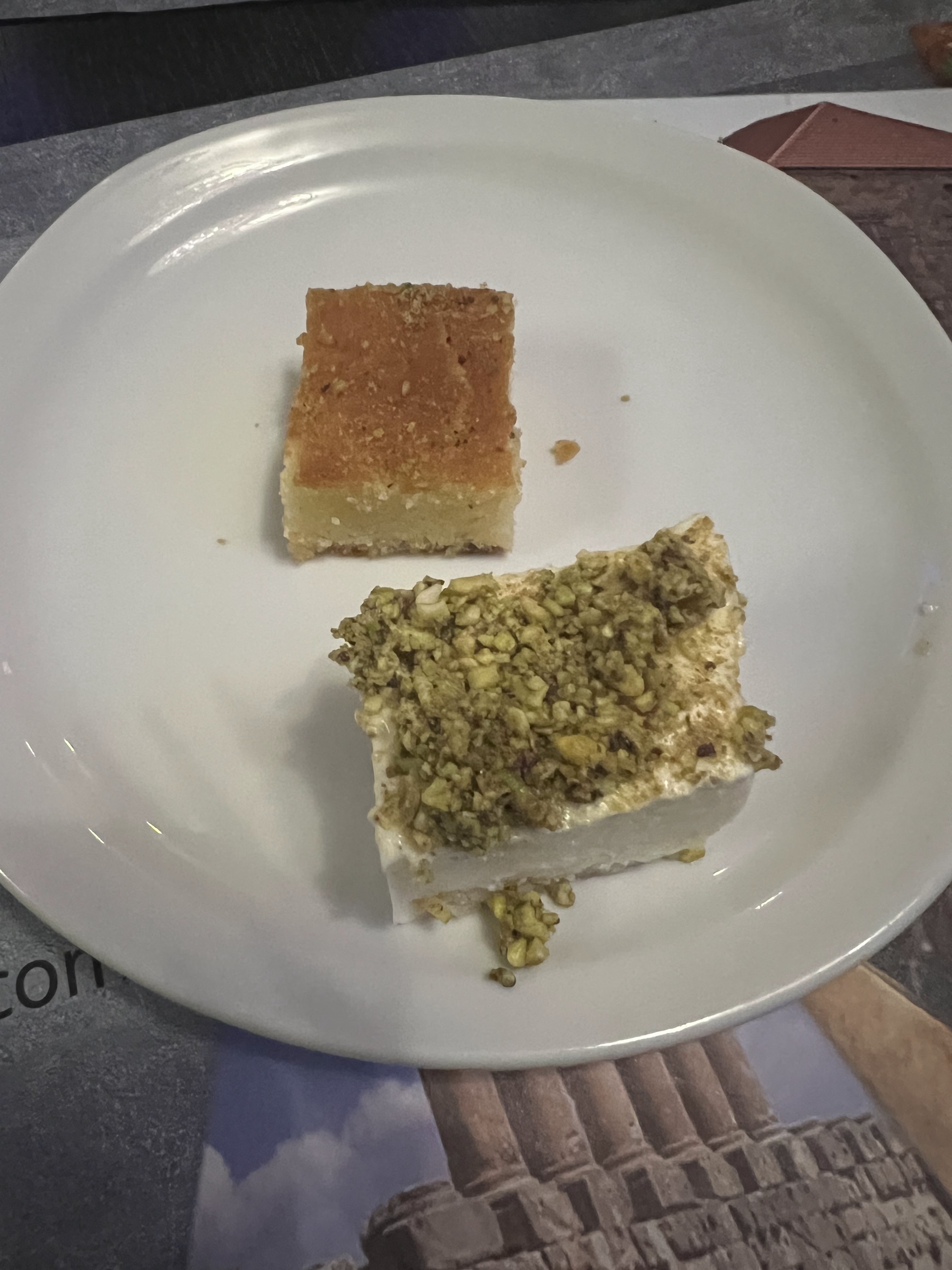 Accueil chaleureux du serveur qui est très agréable. Menu à 25 euros qui comprends plusieurs entrées mais également le plat des brochettes de viande avec du riz, les sauces servi avec étaient un délices ! tout était très copieux, le menu comprends le dessert 2 gâteaux libanais exquis ainsi qu'un thé à la menthe pour digérer ce repas magnifique. 🤌